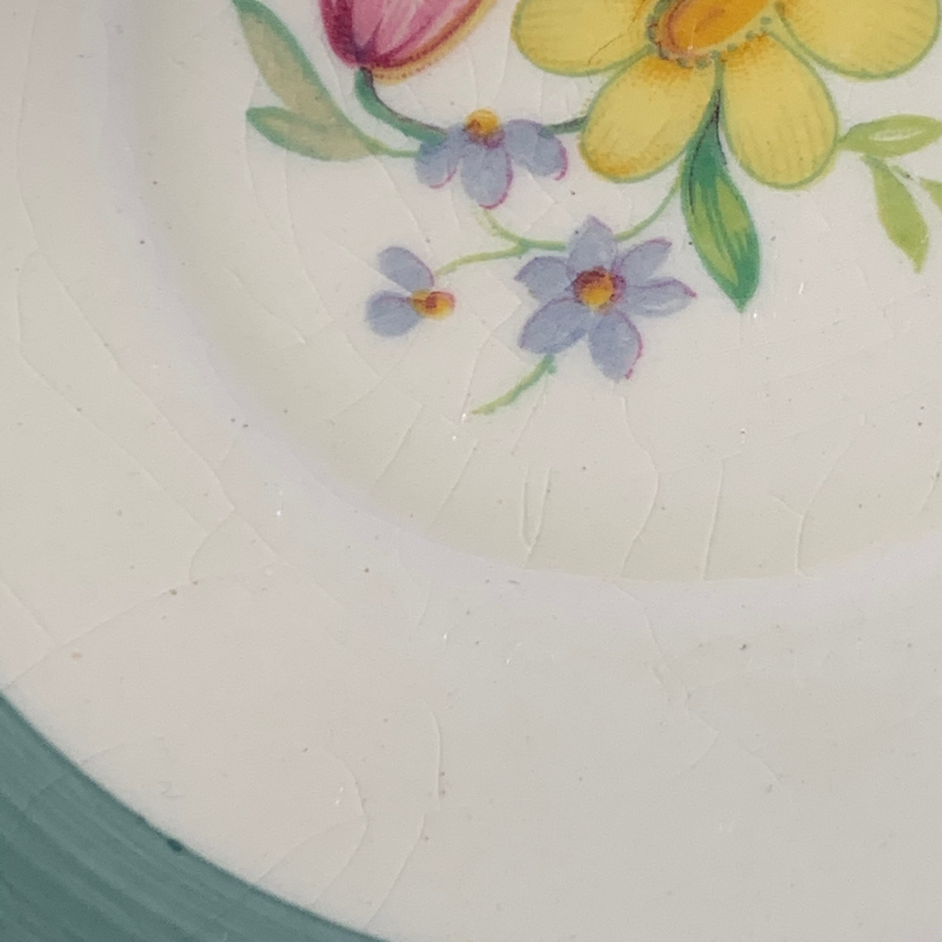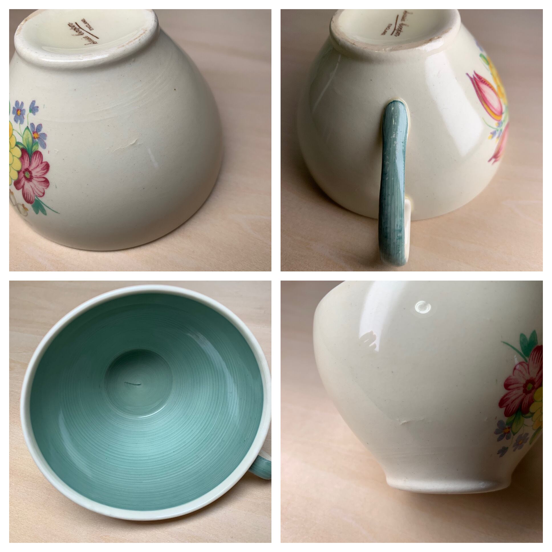 状態ですがカップは持ち手や花柄にスレ跡、突起のように膨らんだ部分があります。