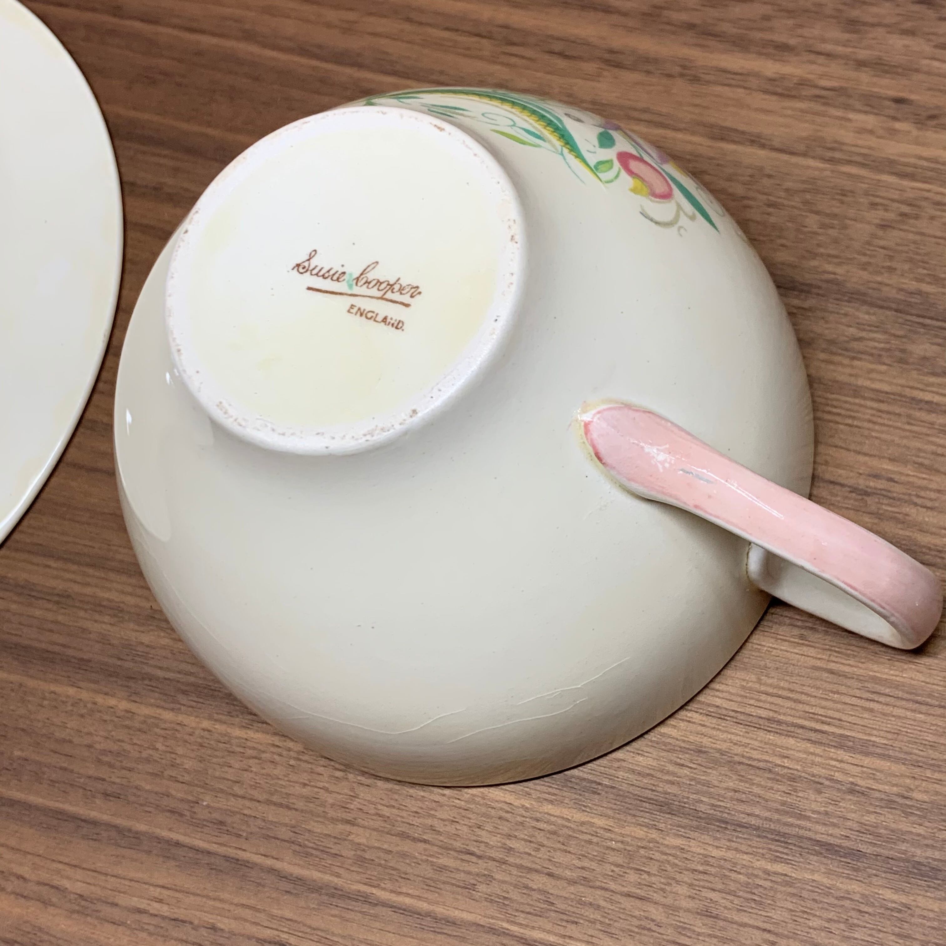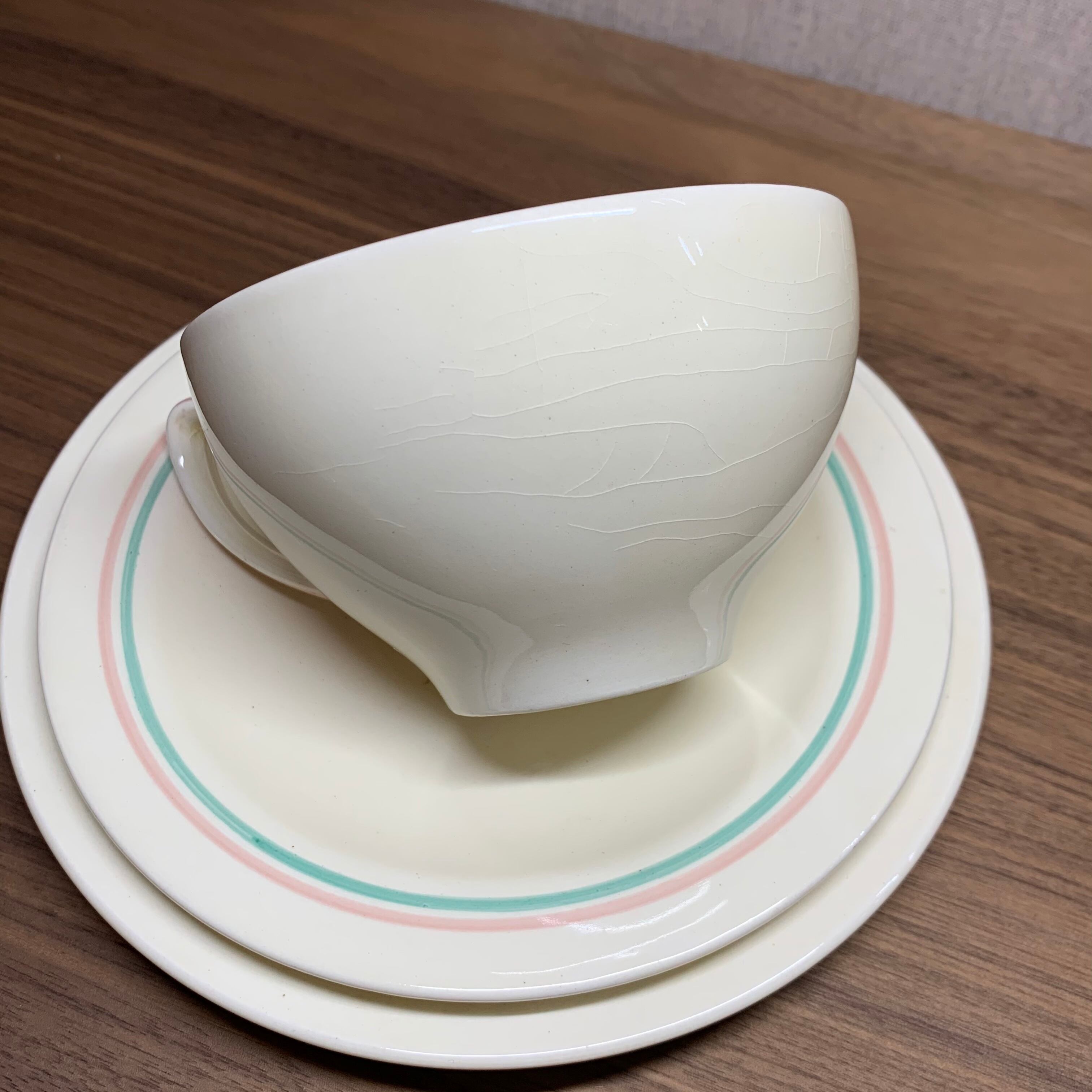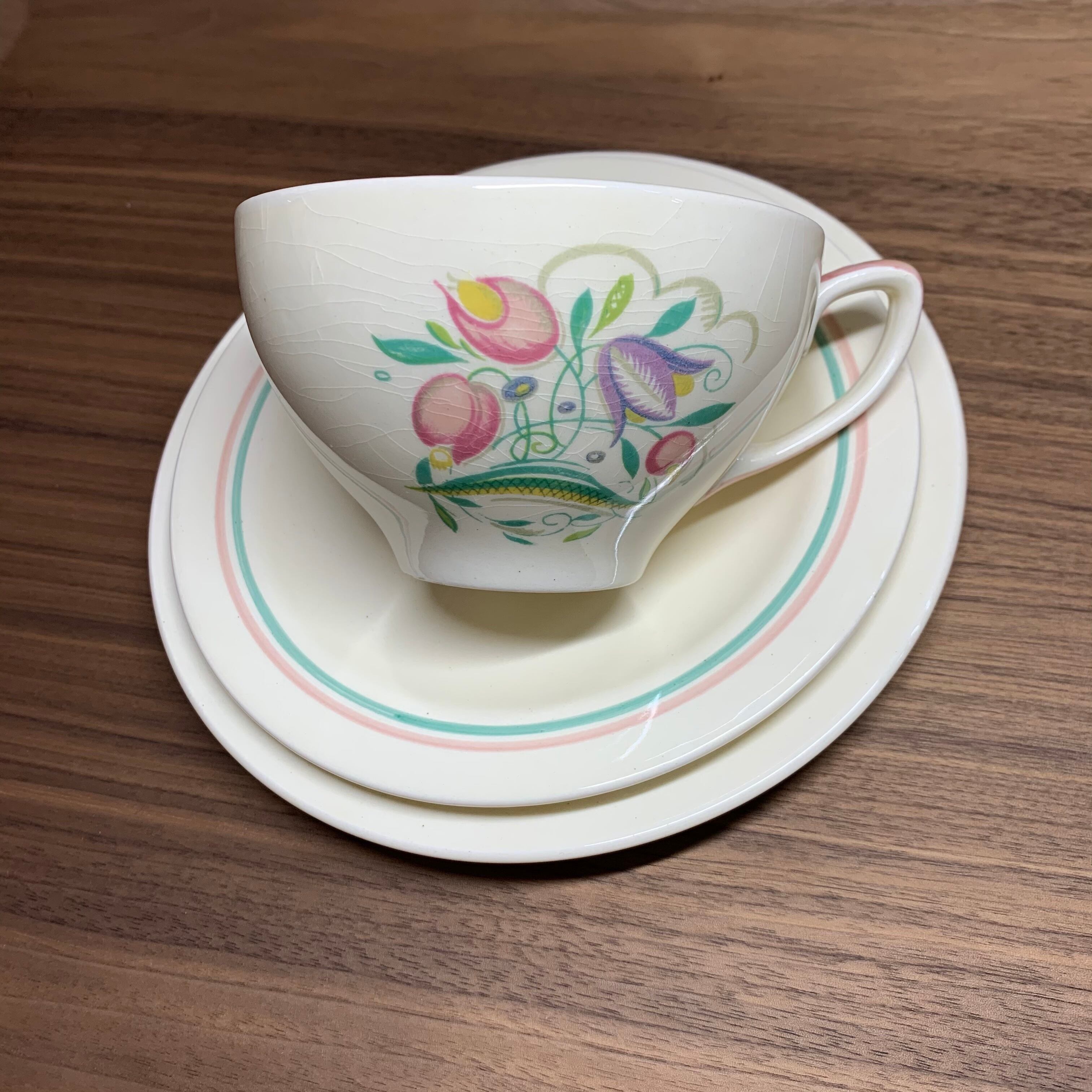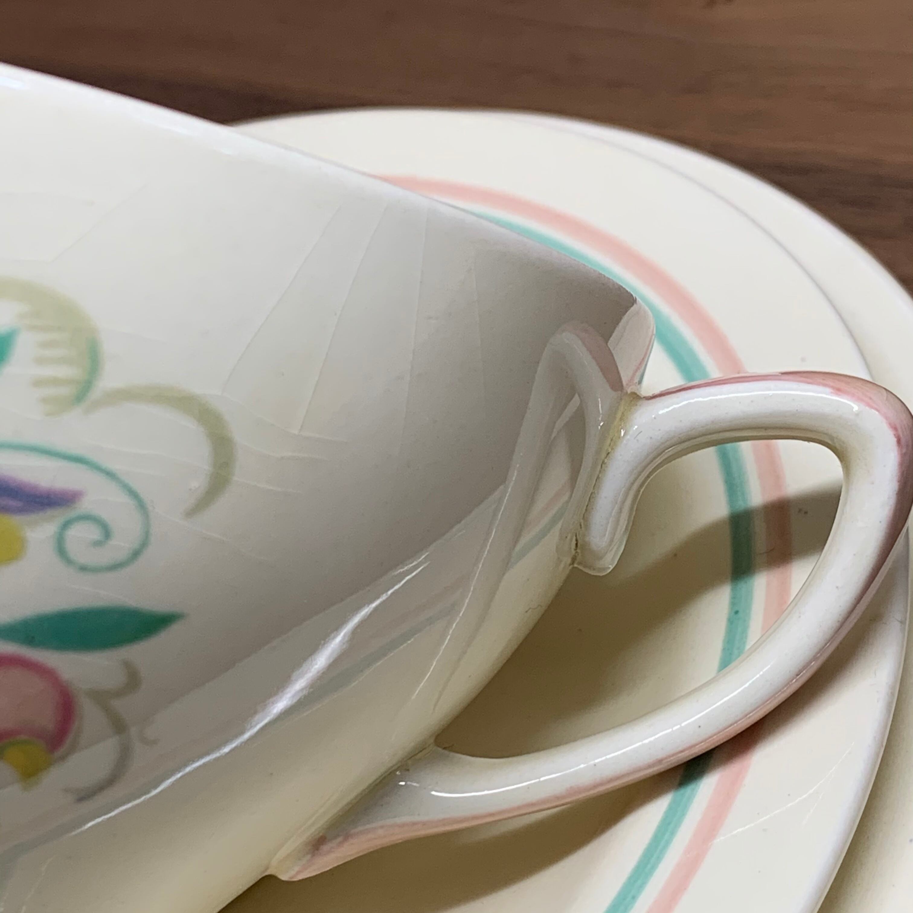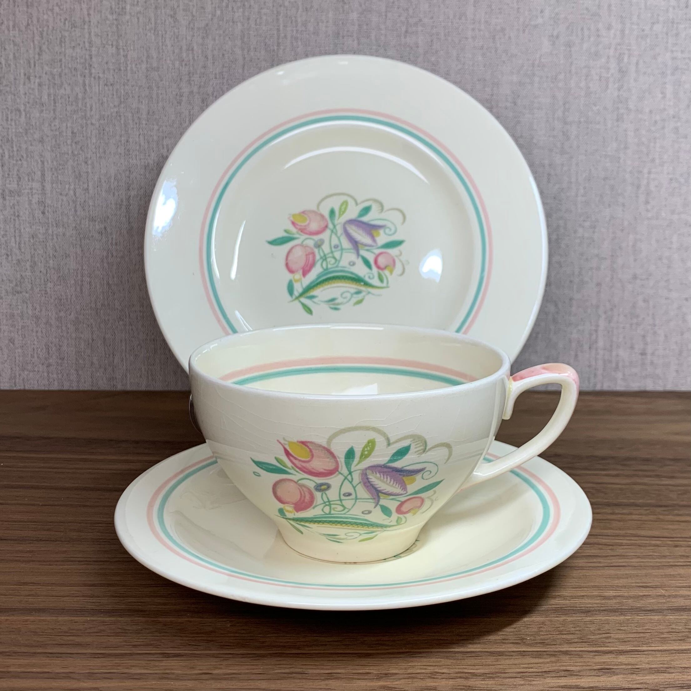 スージークーパー「ドレスデンスプレイ トリオ(ピンク&グリーンライン ブレックファースト)」イギリス製 ヴィンテージ susie cooper