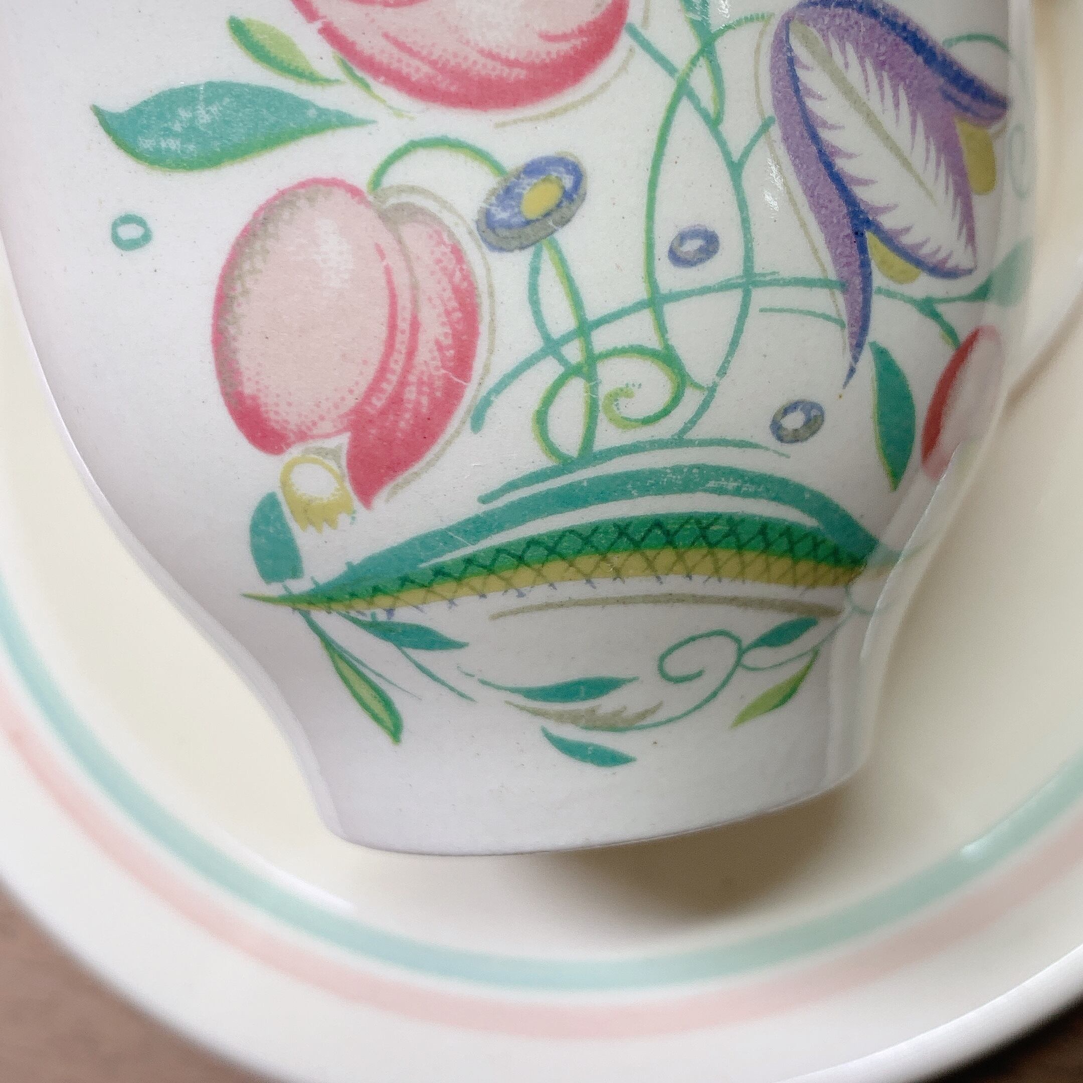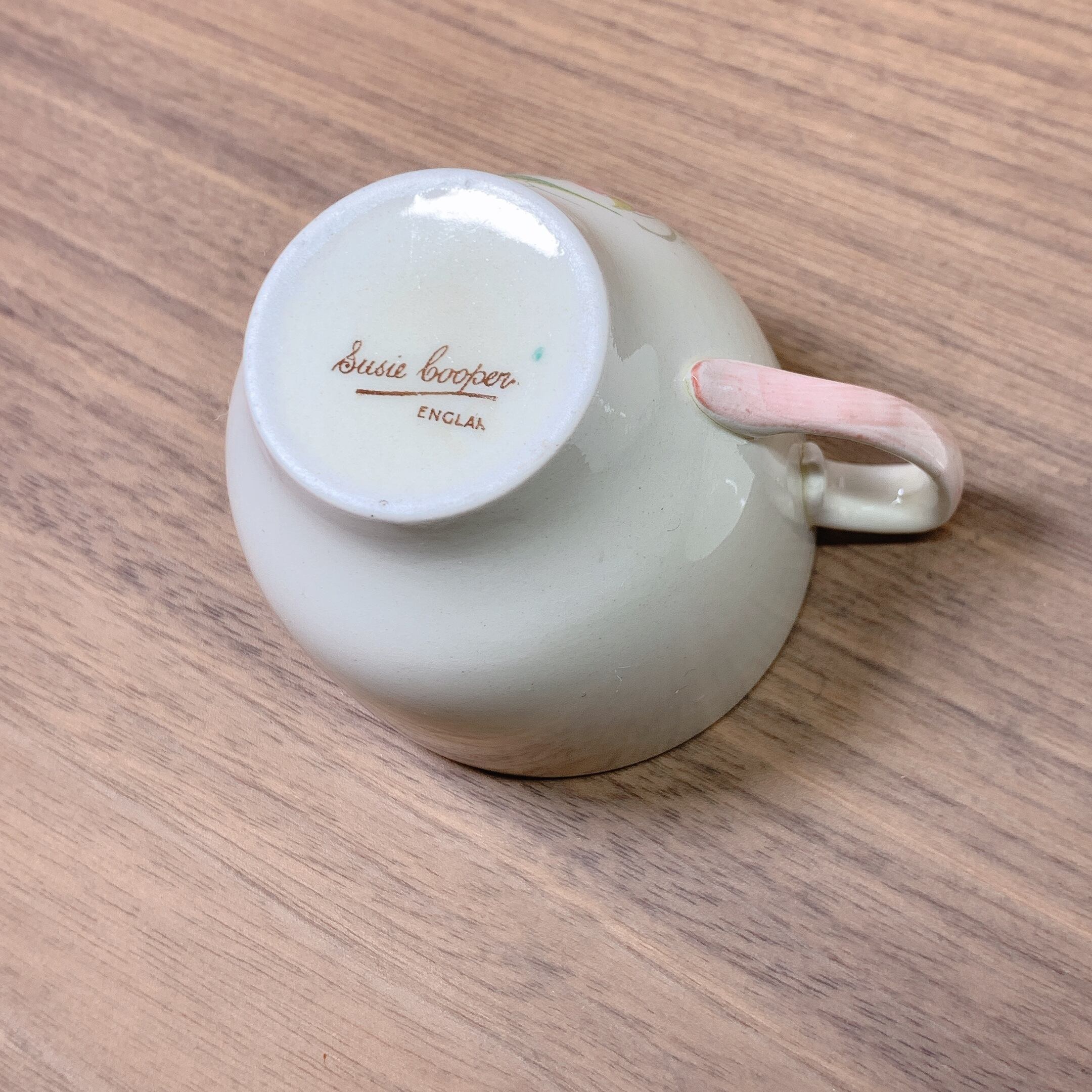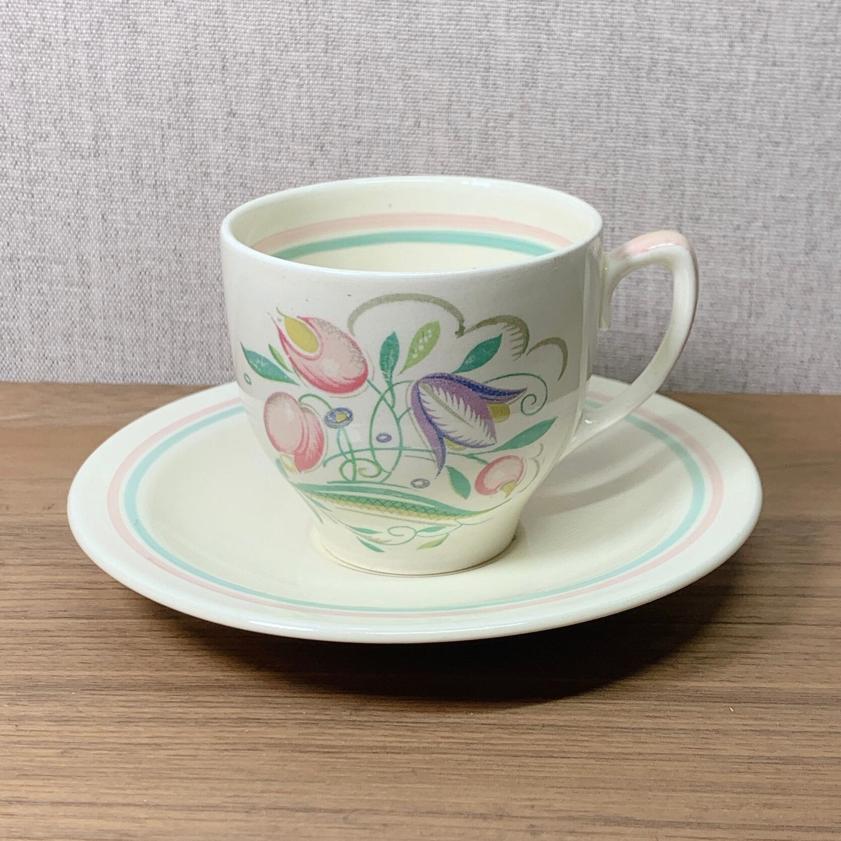 【セール】スージークーパー ドレスデンスプレイ カップ&ソーサー(デミサイズ ピンク&グリーンライン) イギリス製 ヴィンテージ susie cooper E